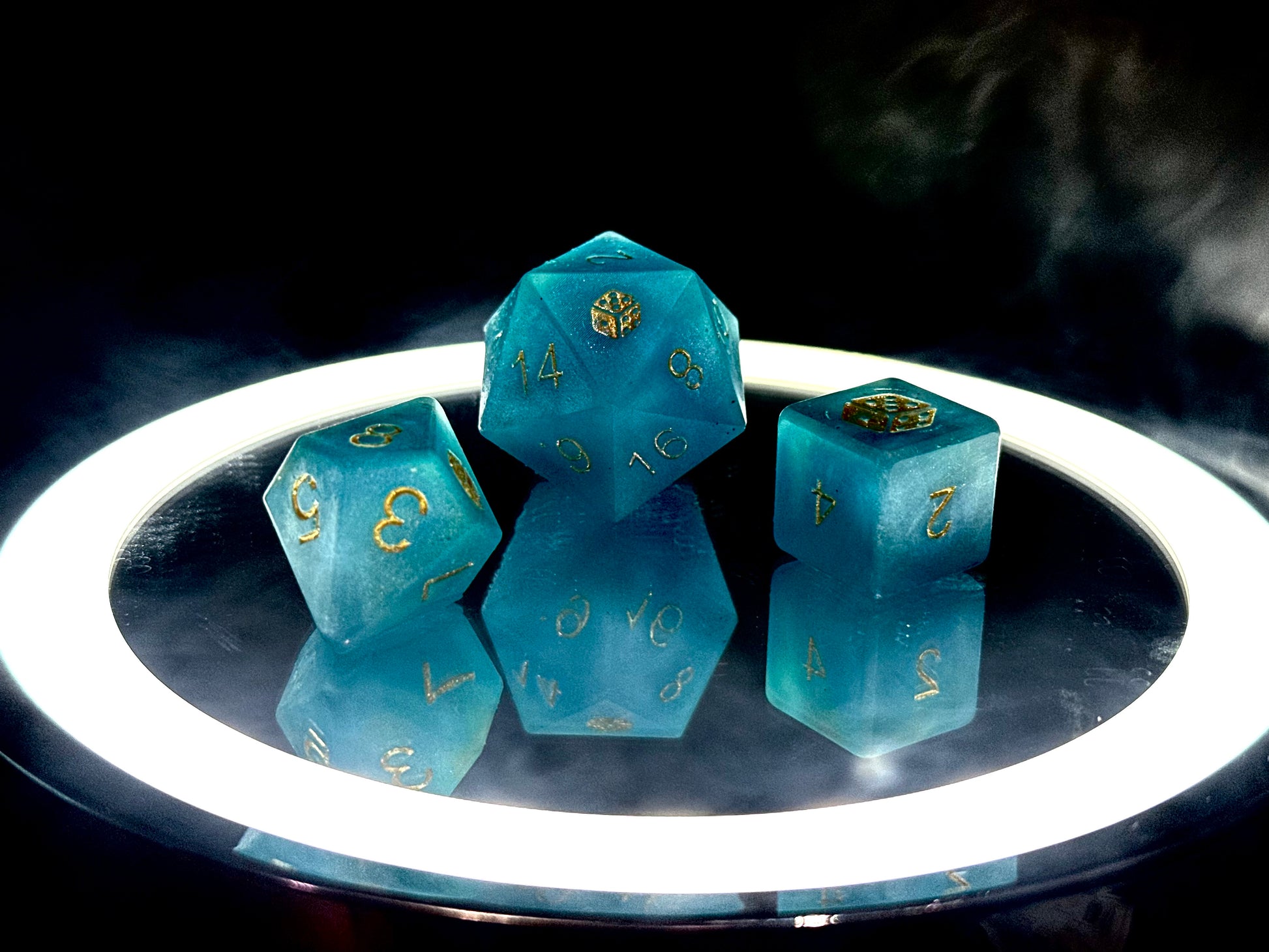 Ten zestaw to unikatowy komplet ręcznie wykonanych kostek żywicznych z odlanym numerem seryjnym, co gwarantuje ich niepowtarzalność.Ten zestaw wyróżnia się intensywnym, lazurowym kolorem z delikatnym, perłowym połyskiem. Złote cyfry pięknie kontrastują z tłem, co nadaje kostkom elegancji i ułatwia odczyt wyników. Kolor i przezroczystość przywodzą na myśl tropikalne wody – świeże i energetyzujące. W komplecie znajduje się pełen zestaw kości RPG, gotowych do gry lub kolekcjonowania.